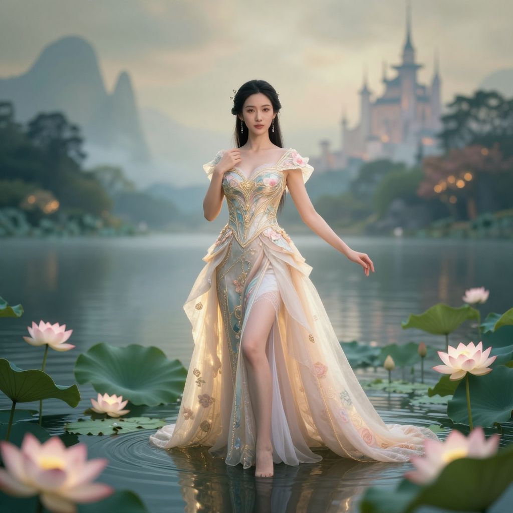 Chivasina resting by a crystal clear enchanted river, surrounded by luminescent plants and magical creatures, tranquil expression, soft pastel colors and glowing reflections, dreamlike and peaceful fantasy setting
