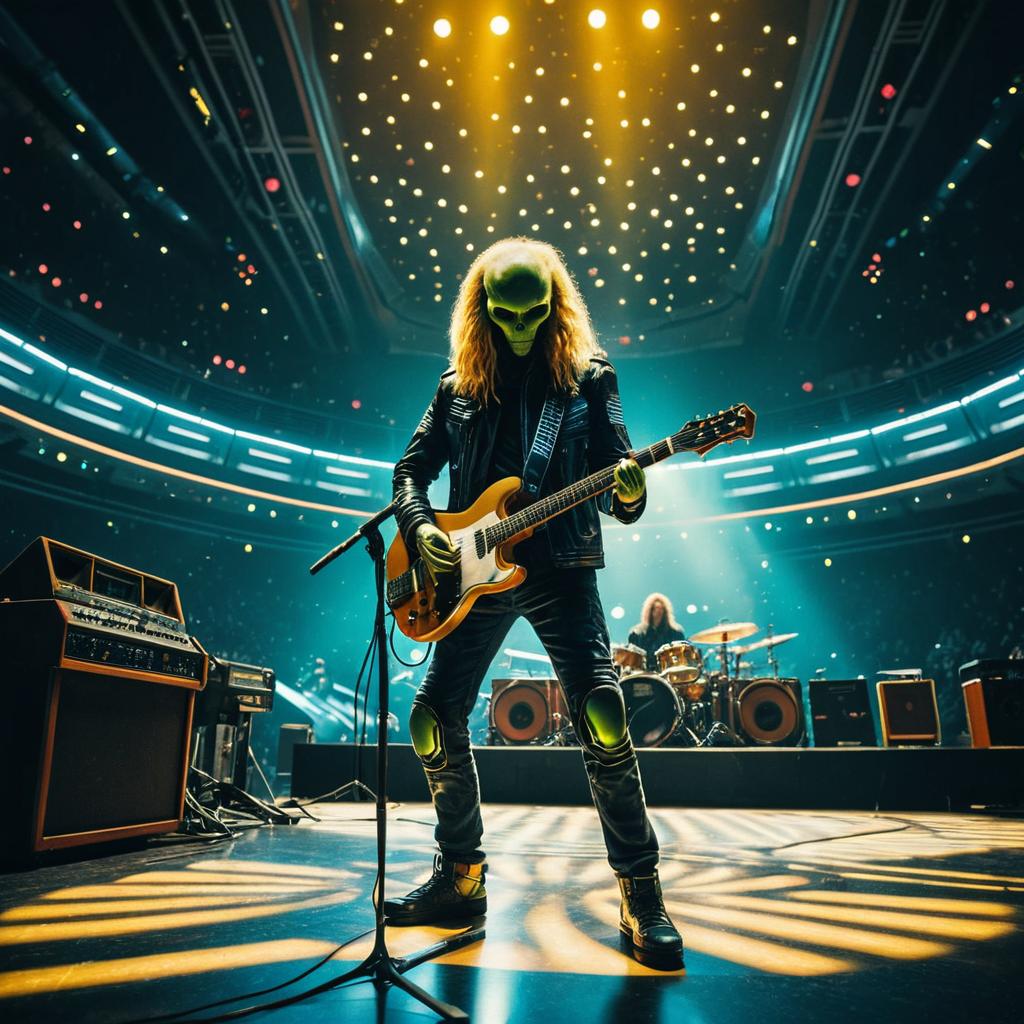 Full-body realistic alien musician with golden hair playing an electric guitar on stage in an intergalactic concert hall. Dramatic moody lighting with cinematic post-processing highlights vibrant colors and retro space art visuals. Indoor modern venue with drum set and speakers, illuminated by a glowing light aura from above, captured in realistic 4K detail.