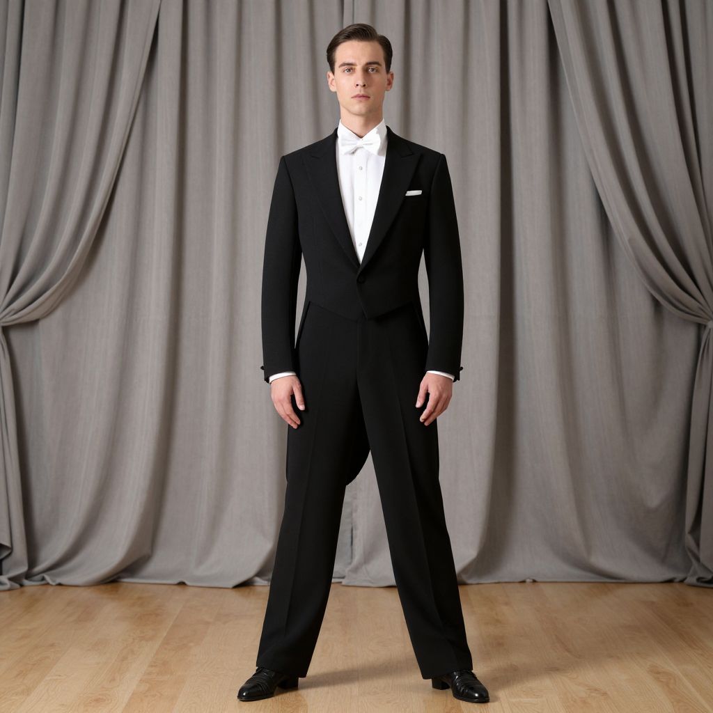 Ballroom Dance Costume Male, man in a tuxedo standing in front of a curtain