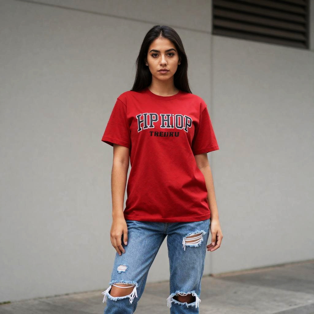 Hip Hop Shirts Vintage, woman in a red shirt and ripped jeans posing for a picture