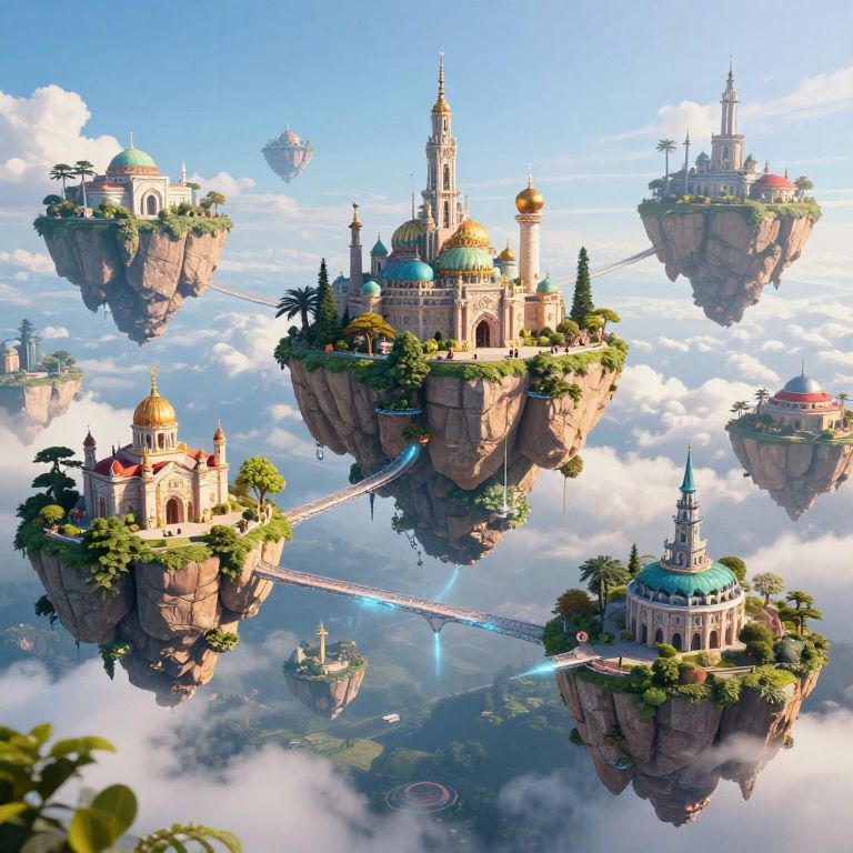 Nations depicted as majestic floating islands in the sky, each with distinct ecosystems and architectural styles, connected by ethereal bridges of light, panoramic view with detailed atmospheric effects and vibrant colors.
