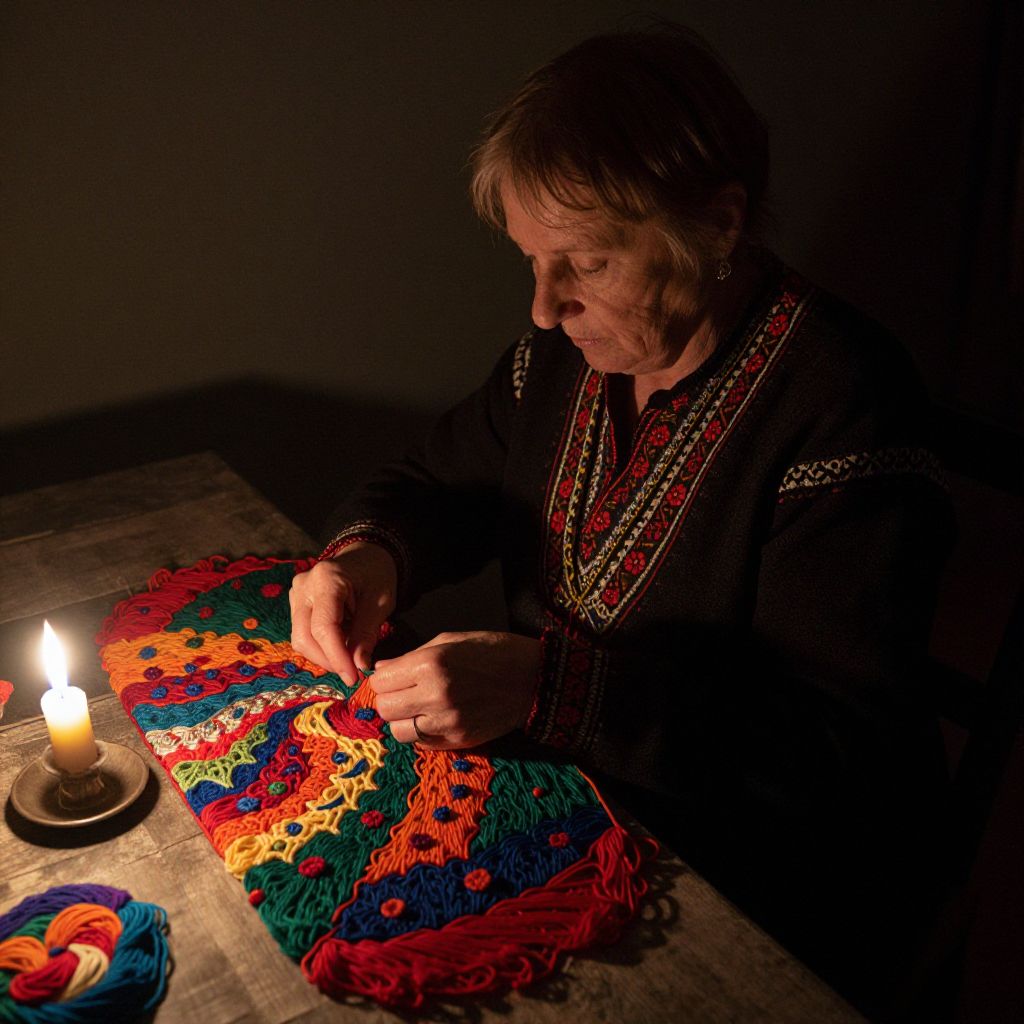 An elderly Nordic woman sits amidst a dimly lit room, her silhouette softly illuminated by candlelight dancing across the table. With delicate fingers, she weaves intricate patterns from colored threads, as if immortalizing memories into tangible art. The camera's gaze captures her focused expression from above, revealing the depth of wisdom etched upon her face, in stark contrast to the vibrant colors and textures that fill this surreal study of time and tradition.