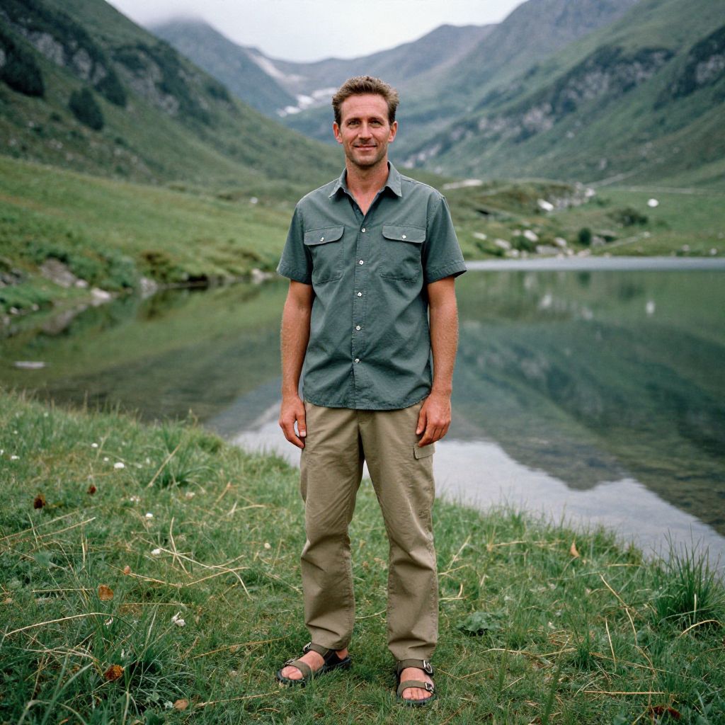A man, short-sleeve button-up shirt, convertible hiking pants, sturdy sandals, khaki and forest green palette, UV protection fabric, serene mountain valley, lush green meadows, crystal-clear lake reflections, kodacolor analog film, relaxed smile. Man has masculine face and piercing eyes