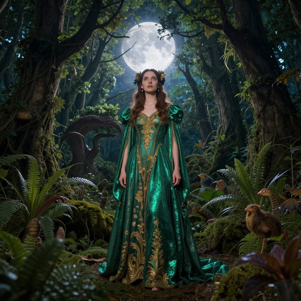 In a breathtakingly detailed and cinematic scene, a young girl with strikingly beautiful features stands in a dense, mystical forest, her face etched with a sense of crisis. Her hair, adorned with delicate ivy, frames her face, while a floral crown adds a touch of elegance. She gazes upwards, her eyes reflecting the ethereal glow of a firefly, as if seeking solace in the enchanting surroundings. The forest, a symphony of green hues, is illuminated by the soft light filtering through the canopy, creating a magical atmosphere. In the distance, an old high tower with a curved clock face stands as a silent sentinel, its numbers up to 8 marking the passage of time in this timeless realm. The tower, with its intricate steampunk design, contrasts beautifully with the natural beauty of the forest. The girl's attire, a flowing dress with intricate patterns, blends seamlessly with the lush greenery, creating a harmonious composition. The overall scene is captured with the precision of a Canon EOS 5D Mark III, using an 80mm lens to emphasize the depth and detail of the image. The lighting is atmospheric, enhancing the mystical quality of the scene, and the composition is carefully arranged to draw the viewer's eye through the various elements, from the girl's face to the distant tower, creating a sense of depth and intrigue.