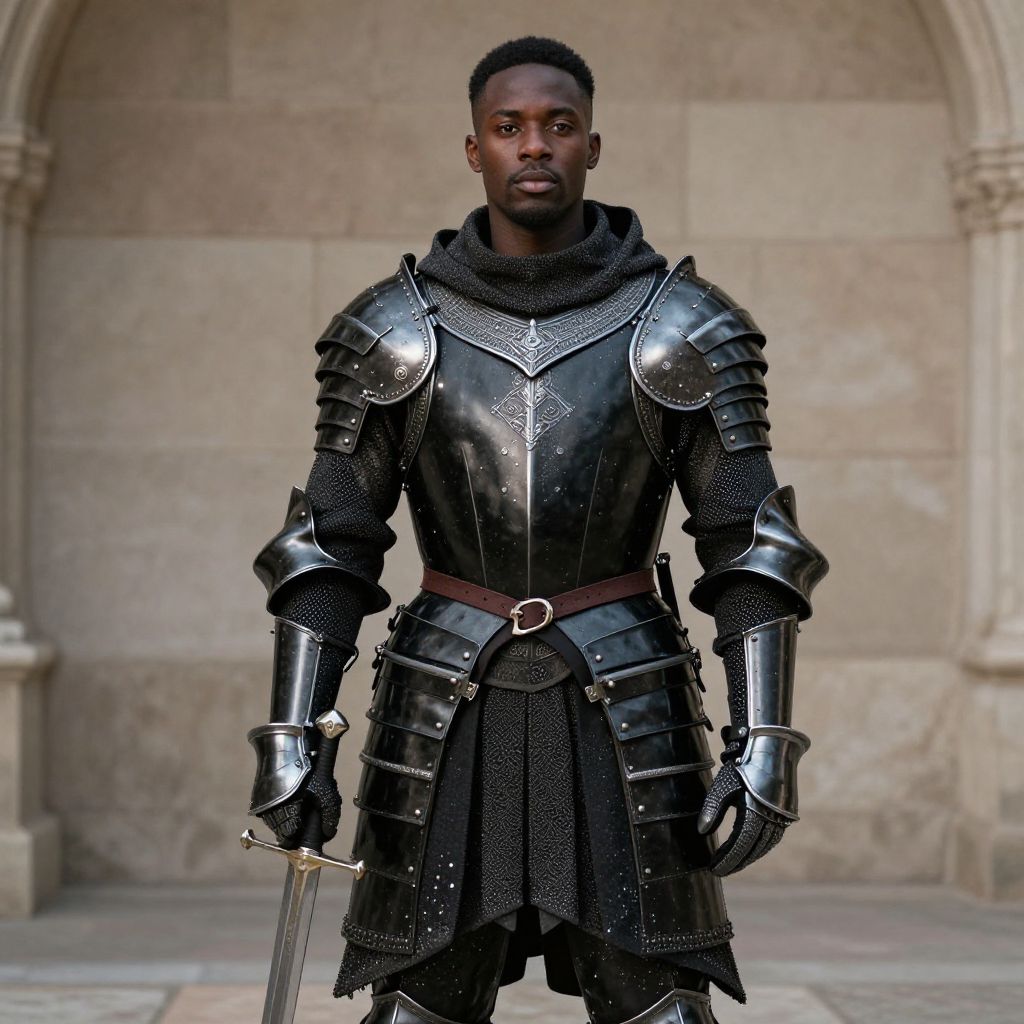 A striking portrayal of a Black Knight in a stunning costume, epitomizing medieval fantasy and chivalry. The man, adorned in detailed black armor with silver accents, stands confidently with a sword, evoking the essence of heroic tales and epic adventures.
