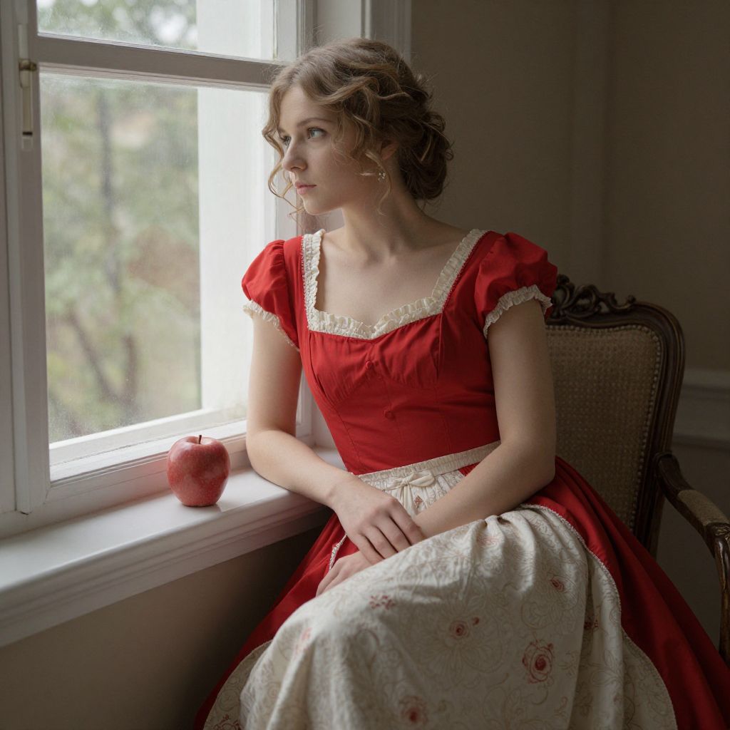 Woman seated by a window, dressed in a vintage red and cream gown, her hands gently resting on her lap as she gazes thoughtfully outside, with a solitary red apple perched on the windowsill beside her.