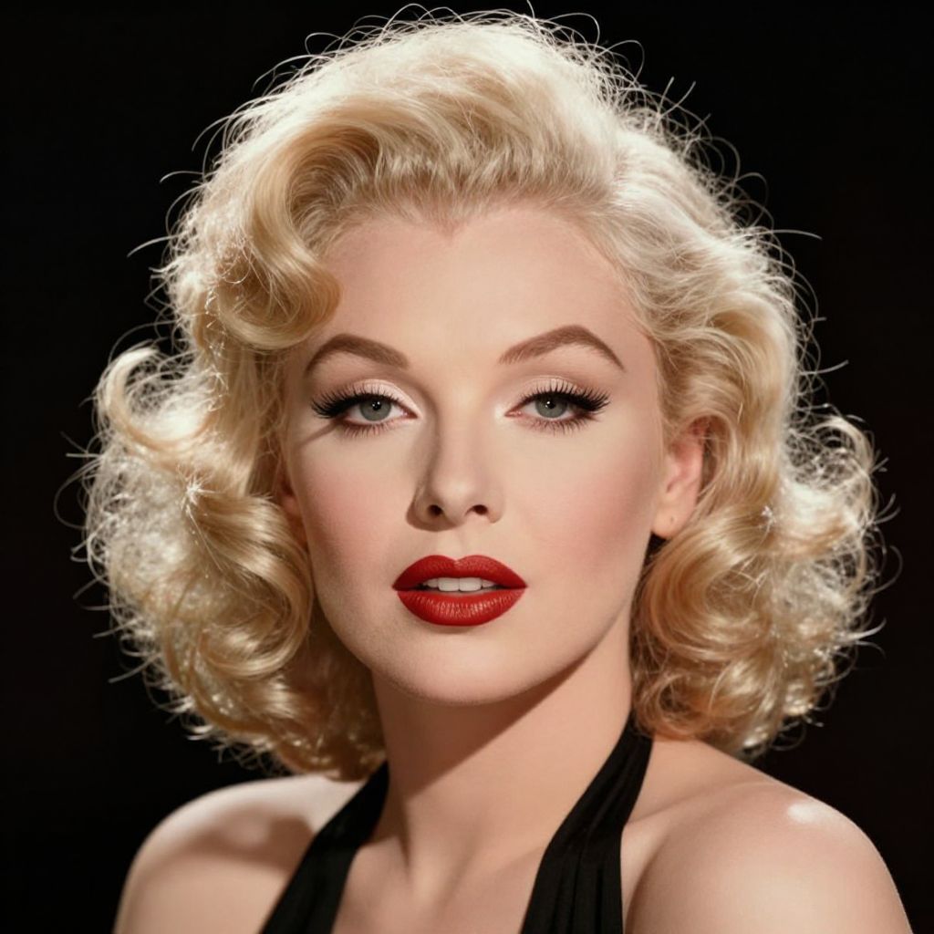 This is a digital illustration of a glamorous woman with a classic 1950s pin-up style. She has platinum blonde, curly hair with a glossy shine, and striking blue eyes accentuated by long, dark eyelashes and black eyeliner. Her full, red lips are slightly parted, showcasing a bold lipstick color. She is wearing a black halter top, and the background is a solid black, making her pale skin and bright features stand out. The image has a high-contrast, hyper-realistic style, emphasizing her flawless complexion and polished appearance. The overall mood is timeless and glamorous.