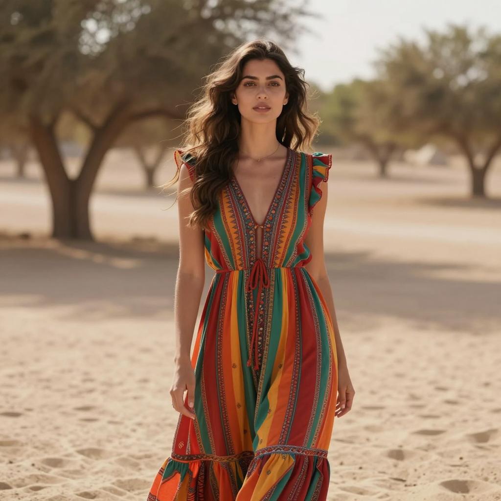 Blonde woman standing in a desert landscape with red rock formations, wearing a long green and red sleeveless dress featuring cactus patterns. She pairs the dress with red arm sleeves and black heeled boots. The scene includes tall cacti and typical desert vegetation under natural daylight.