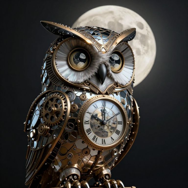 A digital illustration of a clockwork owl, crafted with intricate metallic and mirror-like textures, stands against a dark backdrop, its eyes reflecting multiple fractured moons as it gazes intently at the luminous full moon behind it, creating a mesmerizing blend of steampunk and fantasy aesthetics.