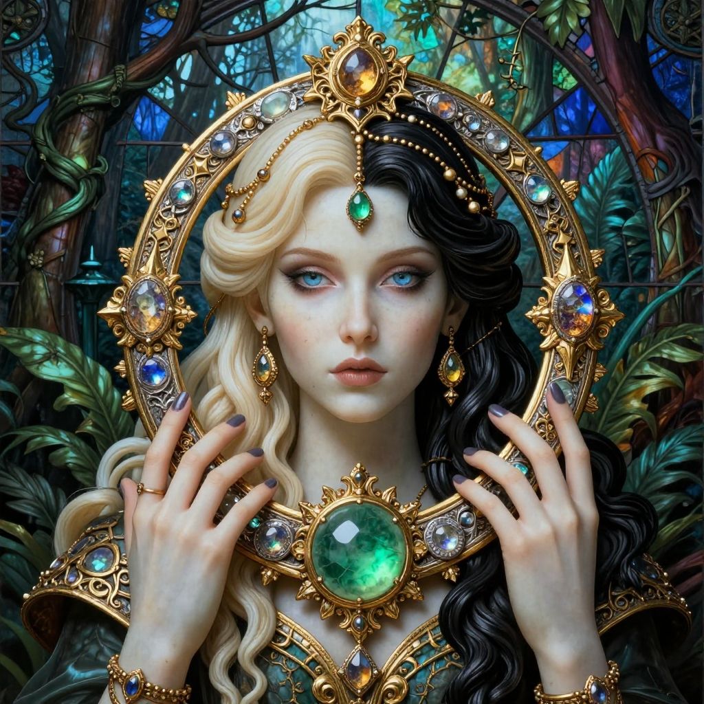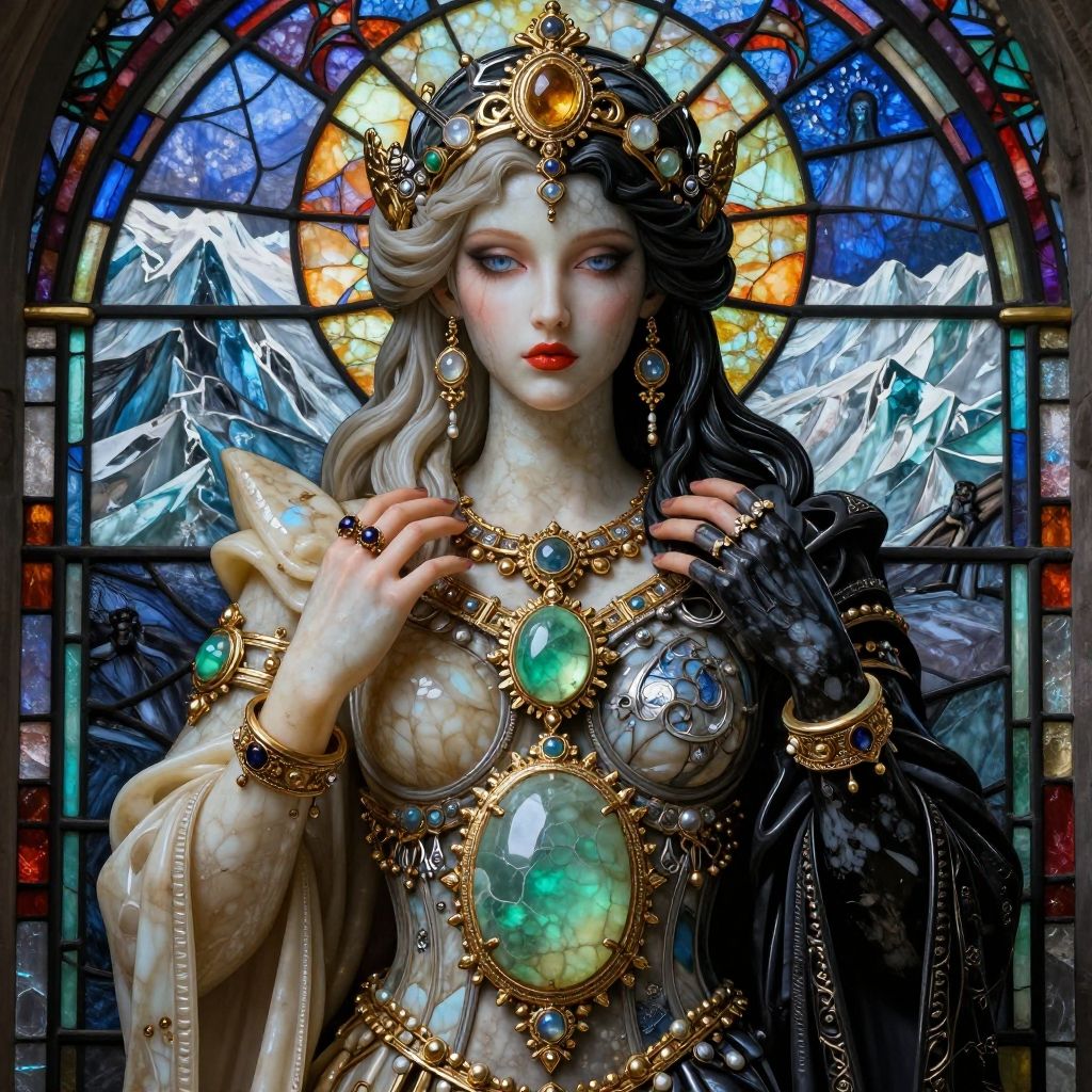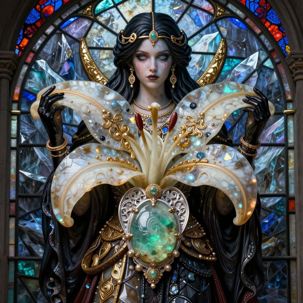 Ivory and ebony and gold and silver and jade ornament of full body Portcullis Vine Deborah Azzopardi, natural, shimmering, vibrant, gothic, rpg, 1400ad, ultra detailed, detailed, immersive, reminiscent of high fantasy RPG games, HD, masterpiece, best quality, hyper detailed, super realistic, perfect face, perfect hands, award-winning, professional, breathtaking, linquiveradreary Glacierhorrible weatherstained glass style . vibrant, beautiful, translucent, intricate
