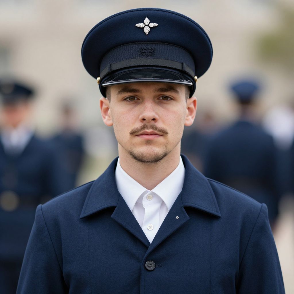 Photograph of a young, light-skinned man with a trimmed beard, wearing a black naval officer's uniform and cap, with a blurred outdoor background
