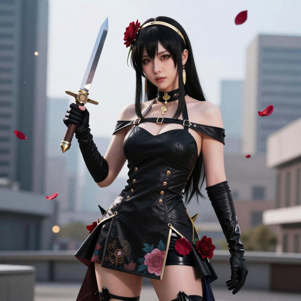 Best quality, ultra high res, (photorealistic:1.4), cute, cityscape, professional lighting, photon mapping, radiosity, physically-based rendering, yor briar, 1girl, bare shoulders, (black dress), black gloves, black long hair, large breasts, closed mouth, cowboy shot, leather dress, earrings, expressionless, fingerless gloves, floating hair, floral print, flower, gloves, gold earrings, gold hairband, hair flower, hair ornament, hairband, holding, holding weapon, jewelry, light particles, long hair, looking at viewer, off-shoulder dress, off shoulder, petals, red eyes, rose, rose petals, short hair with long locks, sidelocks, solo, spikes, thighs, two-sided dress, two-sided fabric, weapon, ((masterpiece)), huge hips, 18 years old cute girl