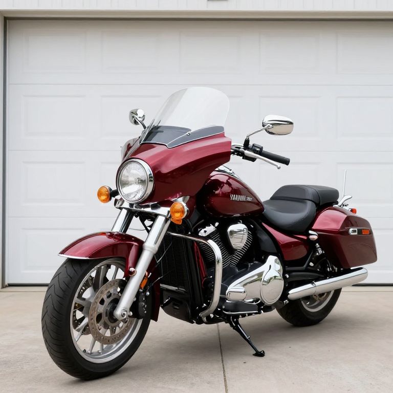 Shiny maroon 2011 Yamaha Road Star S motorcycle parked in front of a white garage door, featuring chrome accents, dual headlights, and a sleek fairing.