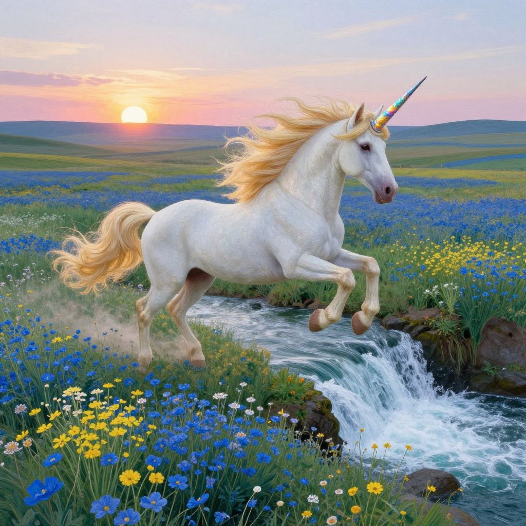 A magical portrait depicting an elegant unicorn galloping through a vivid landscape reminiscent of post-impressionist art. The scene is captured from an aerial viewpoint, showcasing the mystical creature soaring above fields of luminous wildflowers in brilliant shades of blue and green. Its shimmering golden mane dances with the wind as it gracefully leaps over a cascading waterfall, its iridescent horn reflecting the soft sunlight of the setting sun. This enchanting atmosphere evokes a sense of serenity and dynamism, combining ethereal beauty with energetic motion to create an unforgettable visual tale that transports viewers into a dreamlike realm where nature and fantasy harmoniously converge.