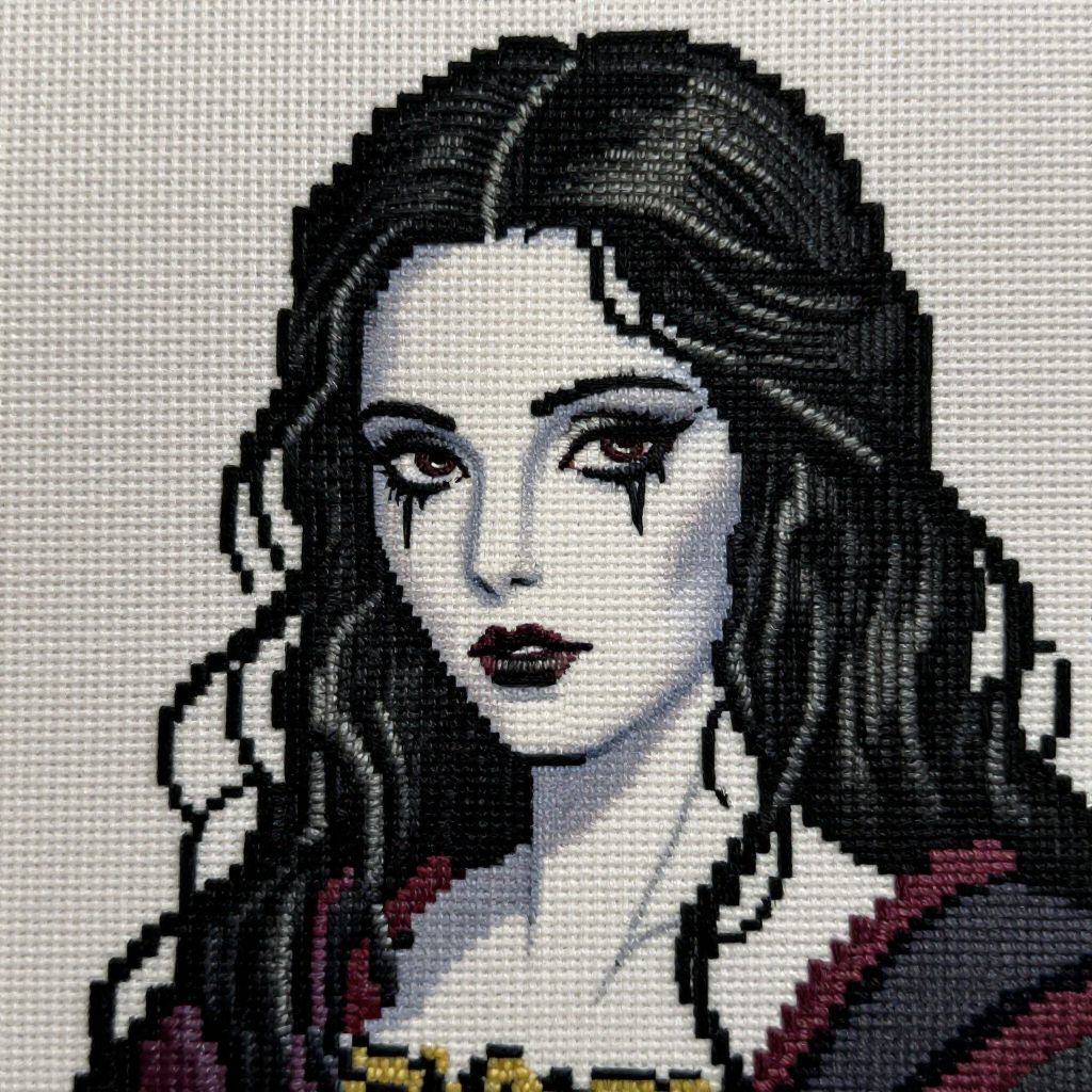 Embroidery Stitch Guide summer eladrin, guard, glowing eyes, warm colors, character art, dnd magical,