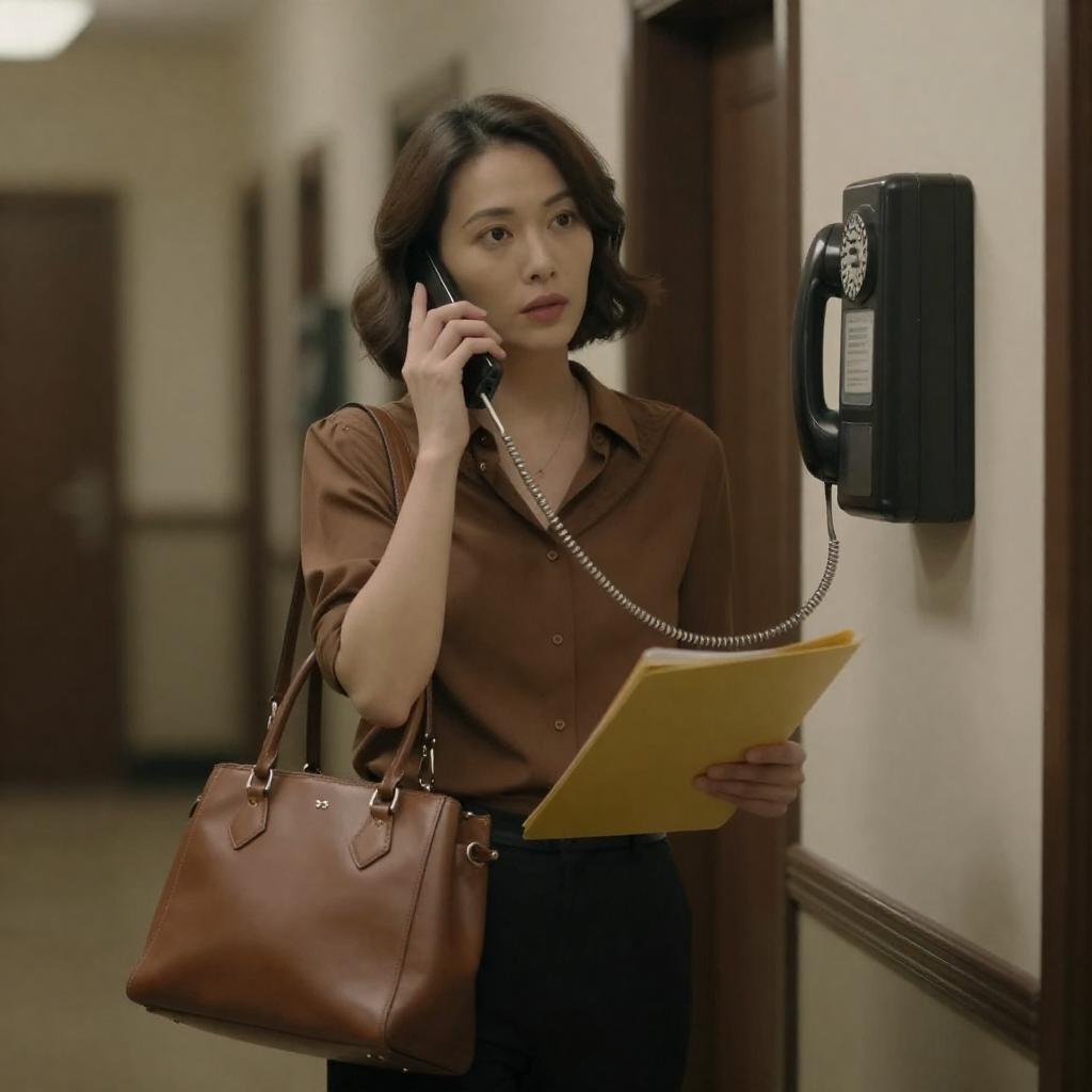 Photograph of a woman with short brown hair, wearing a white blouse and pearl necklace, holding a beige rotary phone to her ear. She has a focused expression. Background shows a man in a beige shirt, slightly out of focus, working at a desk with papers and office supplies. Office setting with desks and filing cabinets.