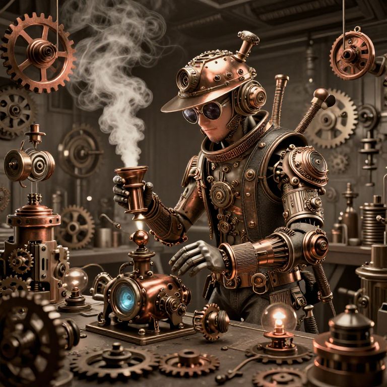 Bev depicted as a steampunk inventor in a cluttered workshop, gears and cogs scattered around, steam and glowing gadgets, sepia tones with vibrant copper highlights, intricate mechanical designs, dynamic and busy scene