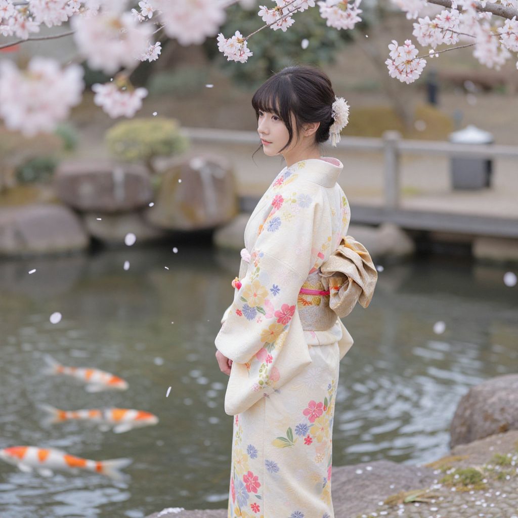 Photograph of a Japanese woman in a white floral kimono, standing by a pond with koi fish, cherry blossoms above, and a wooden