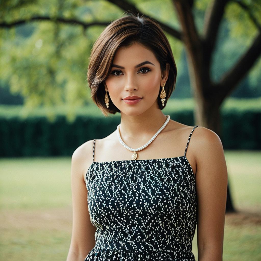 Portrait of a young woman with short brown hair and brown eyes wearing a modern black bakhu dress adorned with small white patterns. She is accessorized with gold and pearl earrings and a pearl necklace with a pendant, standing outdoors in front of a blurred background featuring green trees and grass.