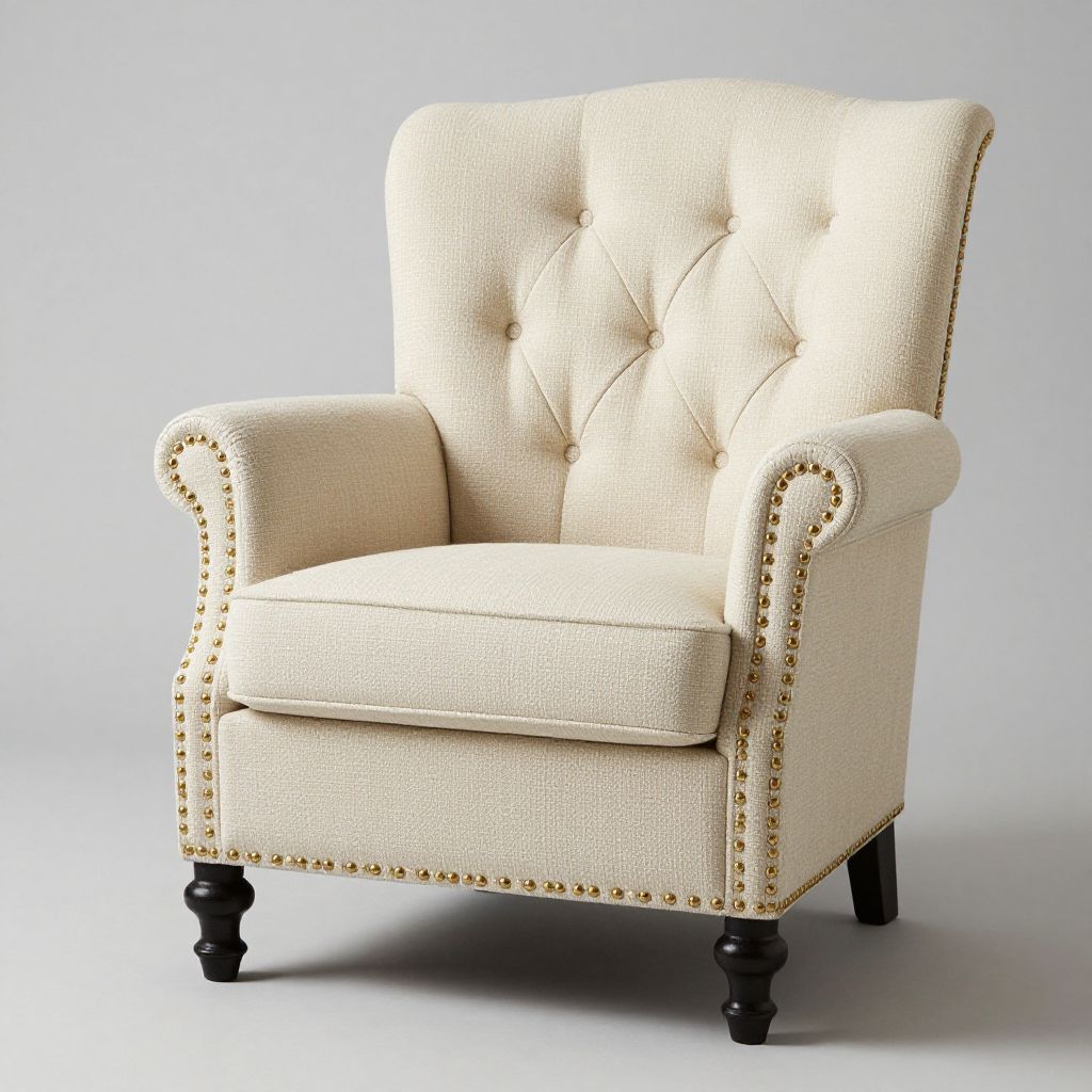 Photograph of a cream-colored, tufted armchair with gold nailhead trim, textured fabric, and black wooden legs, set against a plain