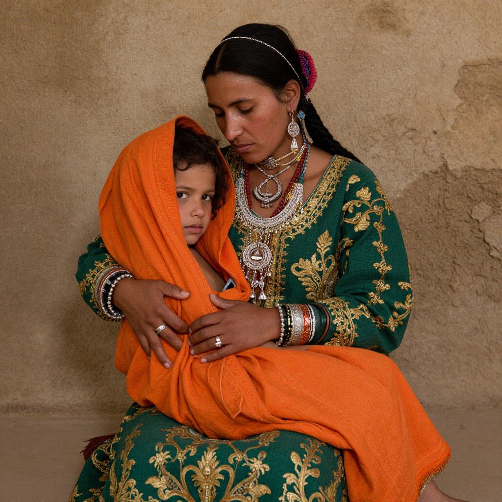 Portrait of a gypsy woman wearing a green dress with intricate gold embroidery and ornate silver jewelry, holding a child wrapped in a vibrant orange cloth. The woman has dark braided hair adorned with a pink flower and multiple rings and bracelets. The background is rustic and textured, emphasizing the cultural and traditional attire.