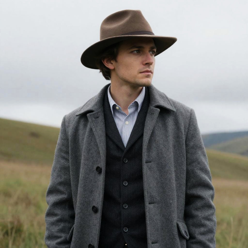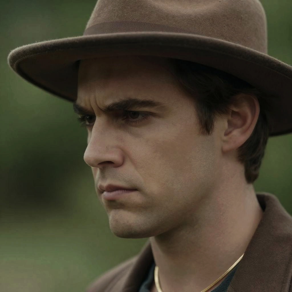 Close-up photograph of a serious-looking white man with brown hair, slightly furrowed eyebrows, and a focused expression. He wears a brown hat and a gold neckpiece. Background is blurred green foliage. Left profile view.