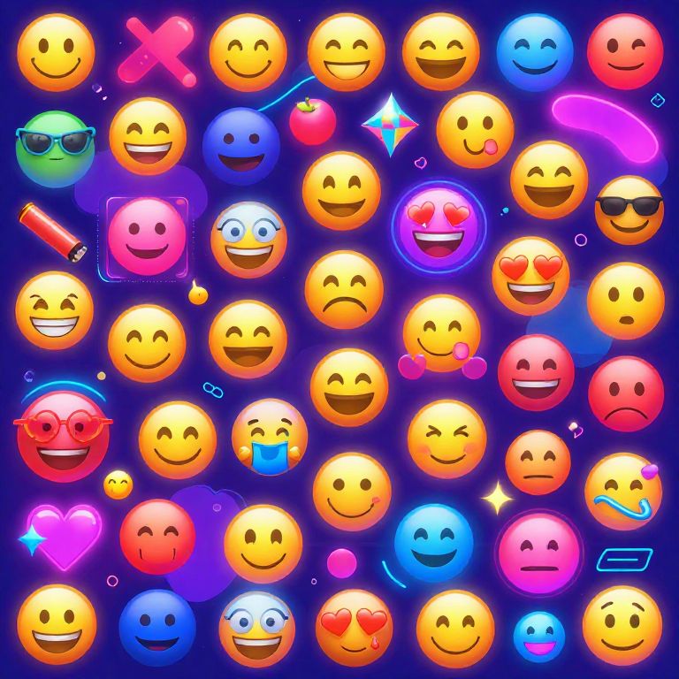 Picture of emojis scattered across a vibrant digital canvas, featuring a diverse variety of expressive faces and symbols, glowing with neon colors, surrounded by abstract shapes and futuristic light effects, capturing playful and joyful emotions in a modern art style.