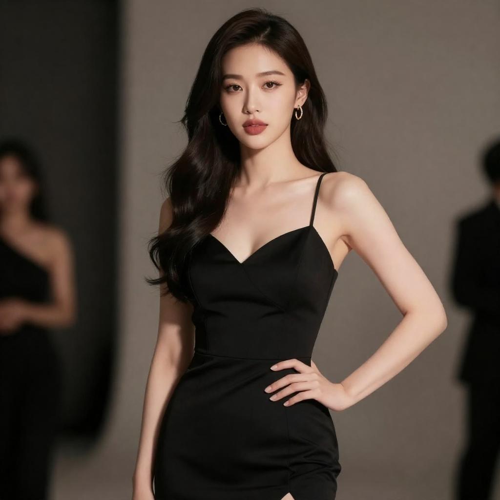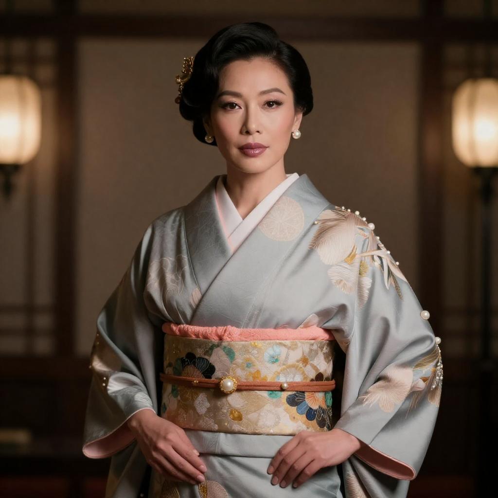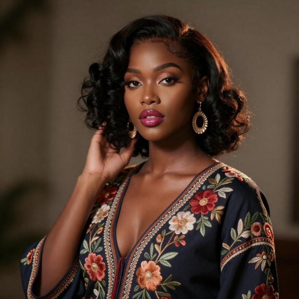 A stunning 27-year-old mixed-race woman exuding charm in a art-deco high-fashion evening suit with sequined blazer. Posing confidently in a classic femme fatale style, she has striking deep wine ombré lips with satin sheen. Captured with a 105mm lens, the photograph emphasizes depth of field, with a shutter speed of 1/800, and an aperture of F/2.5, rendered in breathtaking 8k resolution and HDR quality, enhanced by Unreal Engine 5 with dramatic accent lighting highlighting her captivating beauty.