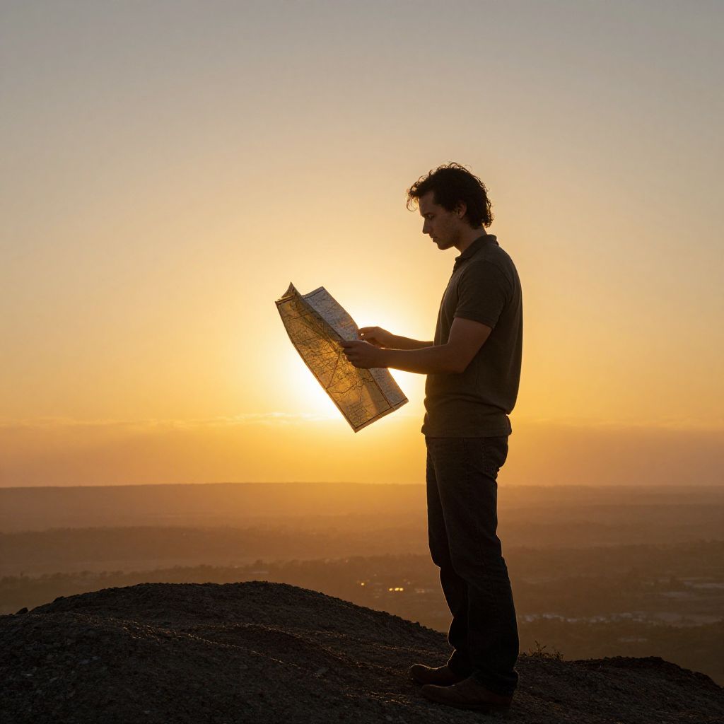 Photograph of a silhouetted man with curly hair standing on a rocky hilltop, holding a detailed map at sunset. He is dressed in a dark t-shirt and pants, with the sun directly behind him, casting a warm orange glow across the sky and horizon. The background shows a vast, flat landscape extending to the horizon. The man's shadow is visible on the ground, and the texture of the rocky surface contrasts with the smooth gradient of the sunset. The image has a serene, contemplative mood.
