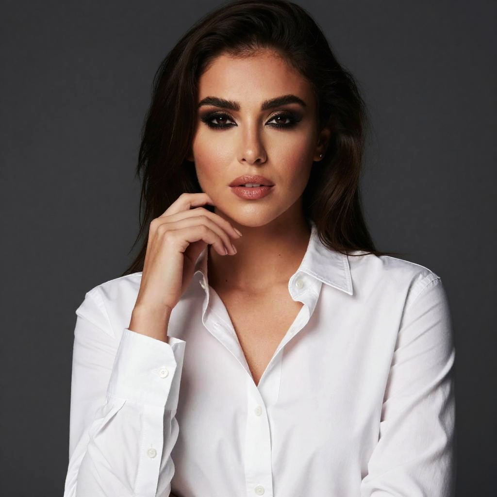 Photograph of a confident woman with long brown hair, dark eyebrows, and smoky eye makeup. She's wearing a white, slightly unbuttoned shirt that reveals a bit of her cleavage. Her right hand is gently touching her chin, while her left arm is crossed over her chest. The background is a solid dark gray, making her and her white shirt stand out prominently.