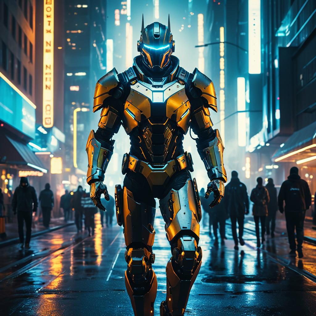 Futuristic cyborg knight roaming neon-lit cyberpunk city street at night, epic full shot with cinematic golden hour lighting and volumetric fog, octane render, ultra-realistic photorealistic 8K hyper-detailed textures, award-winning ArtStation quality.