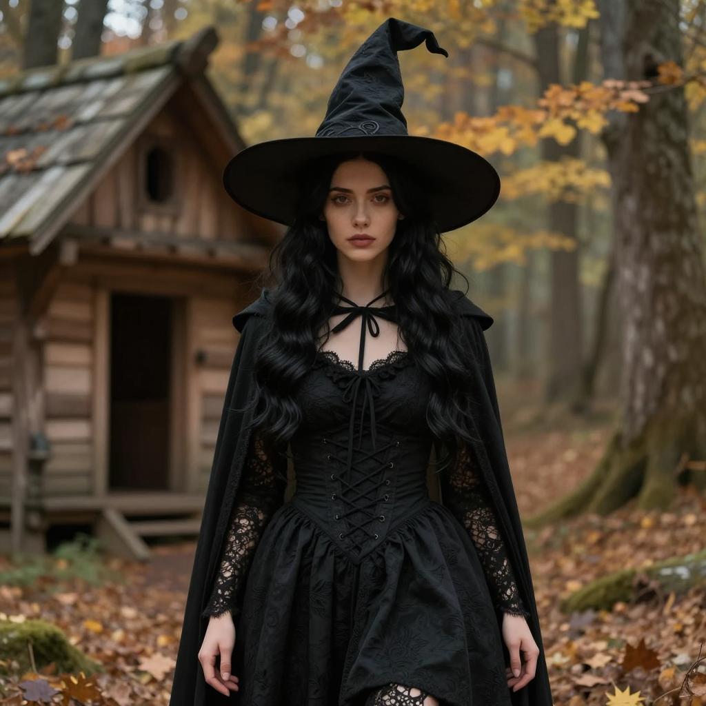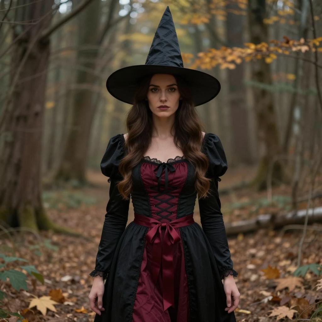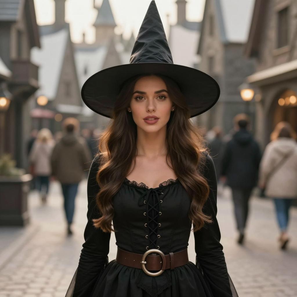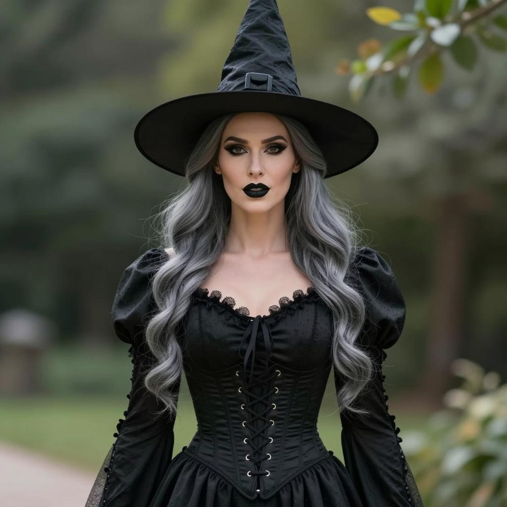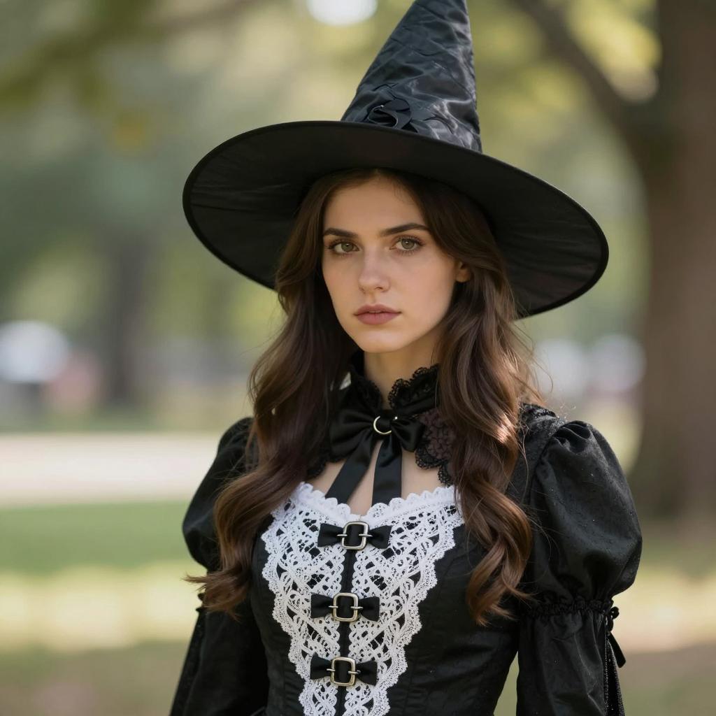 Adult wicked witch costume, photo of a woman with long wavy brown hair wearing a black witch hat and black long-sleeved dress, standing outdoors in a park, sunny day, blurred trees and grass in background, serious expression, realistic style, natural lighting