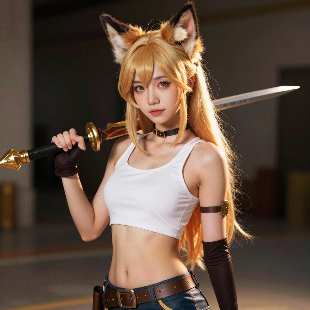 Photograph of an Asian woman with fox ears and red face paint, wearing a black sports bra, choker, and gloves, in a crowded indoor