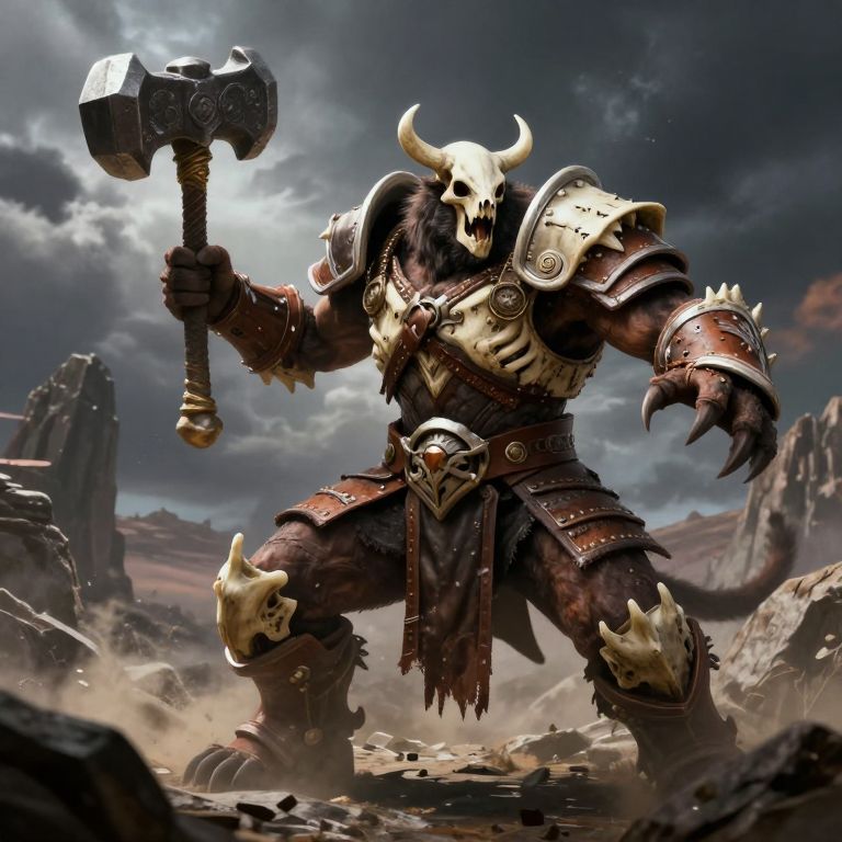 Ogar as a fierce warrior beast, clad in rugged armor made from bone and leather, wielding a colossal hammer, battle-ready stance on a rocky battlefield under stormy skies, dynamic action pose, fantasy art style with vivid colors and dramatic shadows