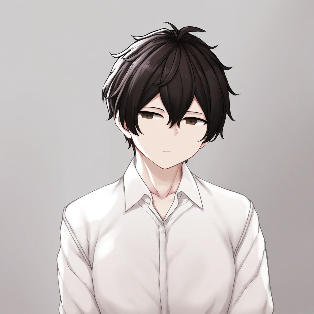 This is a digital anime-style drawing of a young man with black, slightly messy hair and brown eyes. He has a pale complexion and a neutral expression. He wears a white, long-sleeved button-up shirt that is slightly unbuttoned at the top. The background is a simple gradient from light gray to white. The art style is clean and minimalistic, with a focus on the character's subtle, serious expression. The overall mood is calm and understated.