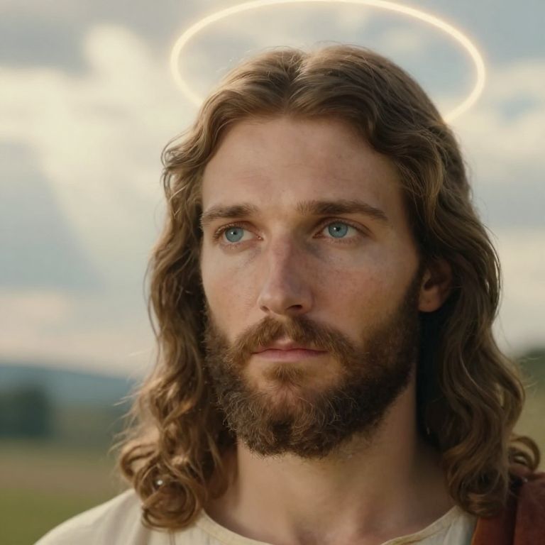 Photograph of a Caucasian man with long, wavy brown hair and a full beard, featuring striking blue eyes. He has a solemn expression and is wearing a simple white tunic. A glowing, circular halo hovers above his head, set against a soft, cloudy sky in the background. The man's skin is fair with a slightly rough texture. His head is slightly tilted to the right, and he gazes directly at the camera. The image has a realistic, slightly surreal quality, emphasizing his divine-like appearance.
