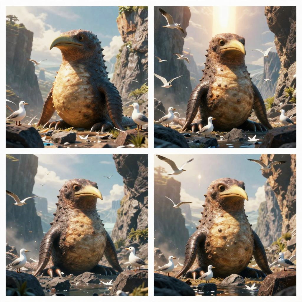 This digital CGI image comprises a four-panel collage of a bird-like creature with a yellow beak and scaly, textured brown and beige feathers. The creature, resembling a mix between a bird and a dinosaur, sits on a rocky, mountainous terrain with tall, jagged cliffs in the background. White seagulls are scattered around the creature, some flying and others perched on the rocks. The sky is bright with sunlight filtering through clouds, casting a warm glow on the scene. The creature appears alert and slightly proud, with a sturdy, upright posture in each panel. The overall style is highly detailed and realistic, emphasizing textures and lighting.