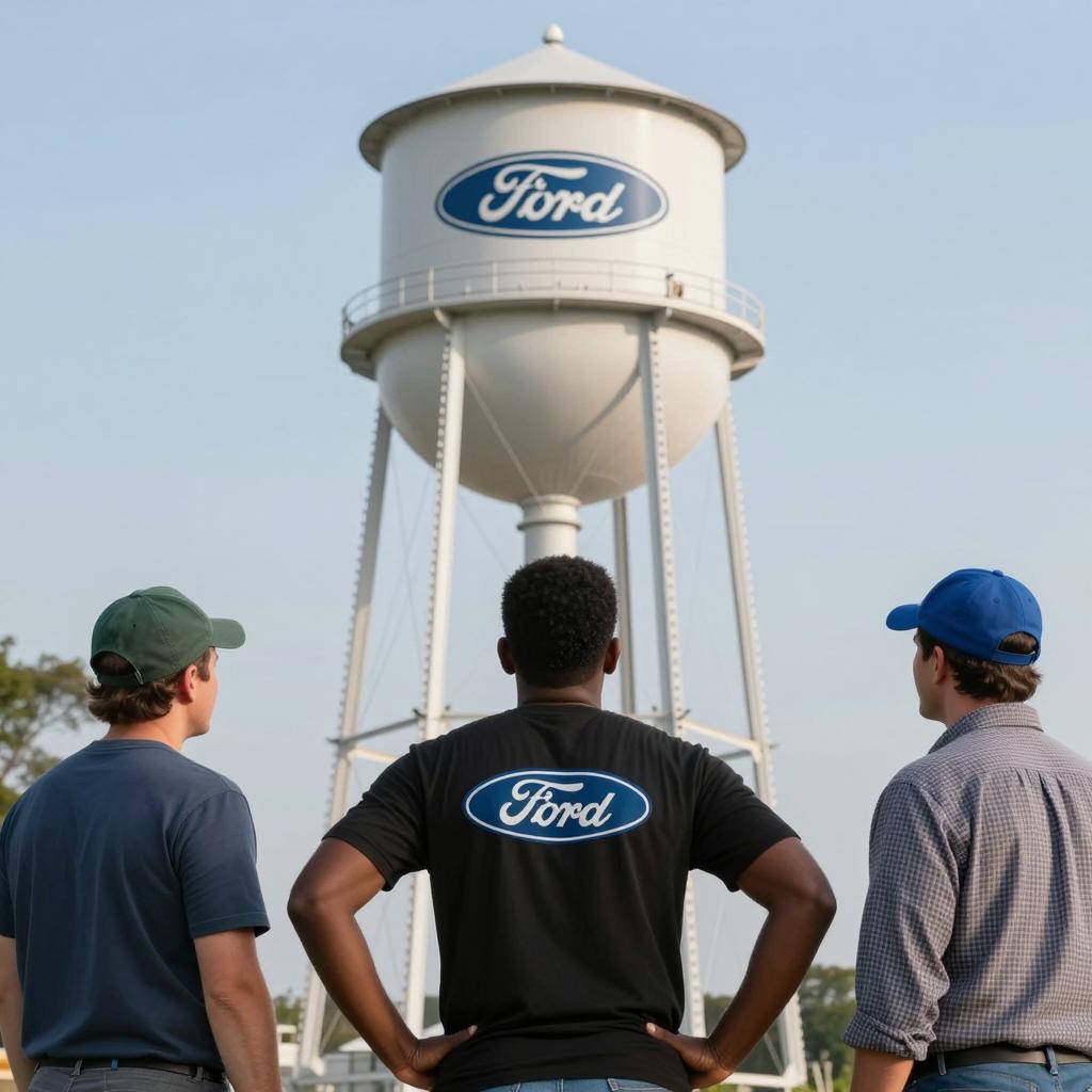 Three men standing in front of a large, cylindrical Ford water tower. The man in the center has dark skin, short black hair, and wears a black t-shirt with hands on hips. The man on the left has light skin, a green cap, and a blue shirt. The man on the right has light skin, a blue cap, and a checkered shirt. Power lines and metal structures are in the background. The water tower has a blue Ford on the side. The men are seen from behind.