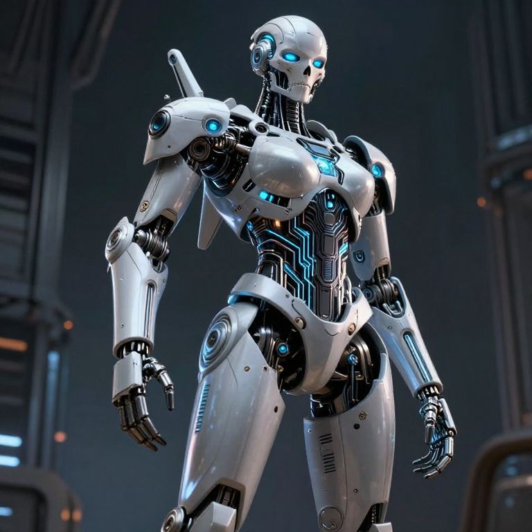 Beside her stands a towering figure, a cyborg with a skeletal face and a mechanical body, a fusion of organic and artificial elements. The cyborg's body is covered in intricate circuitry and mechanical components, glowing with a soft blue light that contrasts with the dark, industrial background. The character's posture is imposing, with a slight lean that exudes confidence and power.
