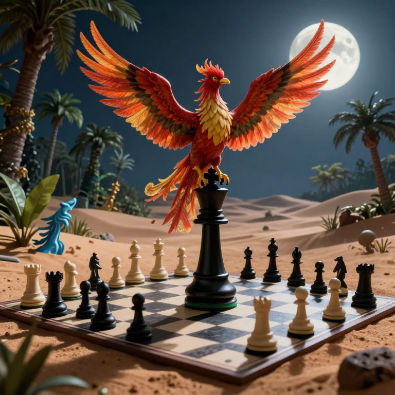 Digital artwork of a fiery, red-orange phoenix with outstretched wings perched on a black chess piece, commanding a desert chessboard under a full