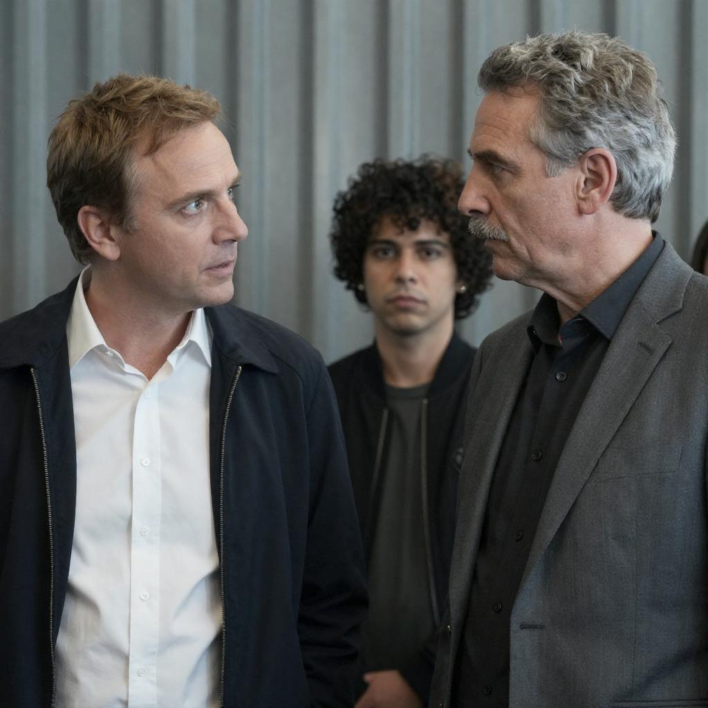 Photograph of four people standing closely together in a dimly lit room. A woman with dark hair in a white top and black jacket stands left, a man with short dark hair in a black shirt stands center, a man with curly hair in a plaid jacket stands right, and a man with a mustache in a dark suit stands far right.