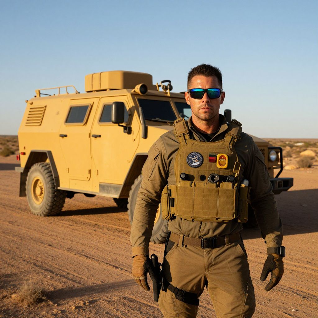In the image, a rugged, action-packed scene unfolds in a desert landscape under a clear, golden-hour sky. A man, dressed in tactical gear, stands in the foreground, his face partially obscured by a pair of reflective sunglasses. His attire includes a bulletproof vest with various patches and gear attached, suggesting a high-stakes mission. Behind him, a large, heavily armored vehicle, painted in a utilitarian shade of yellow, is parked on a dirt road. The vehicle's robust design and the man's gear indicate a readiness for combat or a dangerous operation. The desert environment, characterized by sparse vegetation and rugged terrain, adds to the sense of isolation and tension. The lighting, with its warm tones and sharp contrasts, enhances the dramatic and intense atmosphere of the scene.