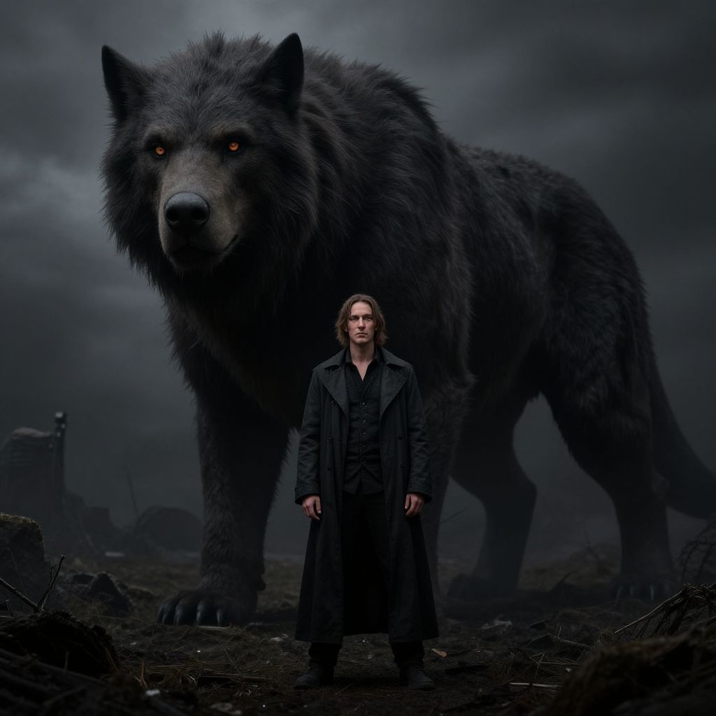 Photograph-style CGI: Tall, serious woman in dark coat stands before enormous, menacing, glowing-eyed, black wolf in stormy, dark landscape.