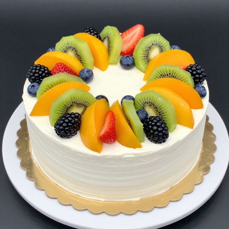 Circularly arranged slices of mango, kiwi, strawberries, blackberries, and blueberries adorn a pristine white frosted cake, creating a vibrant floral pattern atop a scalloped gold base and white plate.