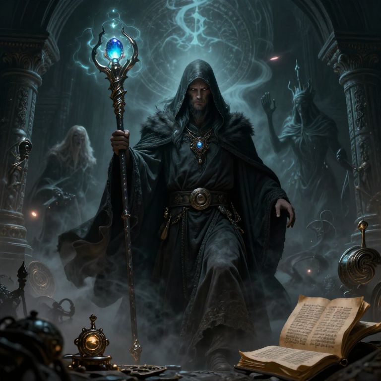 Mysterious dark-robed wizard with glowing blue orb staff, surrounded by fog, ancient columns, and open books in a mystical, gothic chamber.