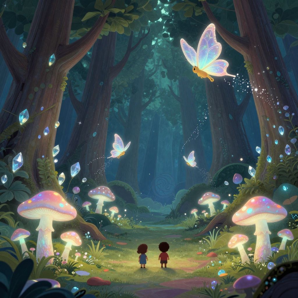 Whimsical forest scene: two children face glowing mushrooms, surrounded by luminescent butterflies and crystals, illuminated by magical forest light. Digital art.