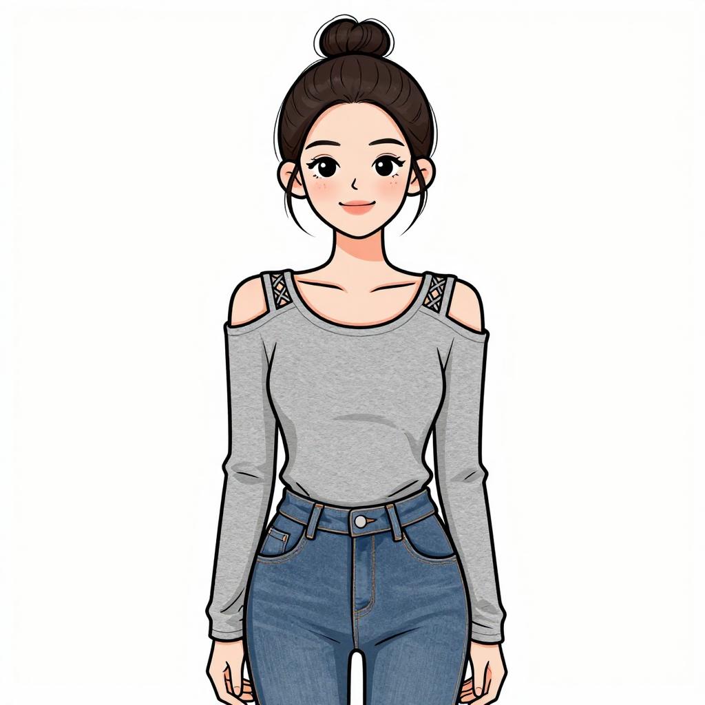Digital illustration of a young woman standing against a white background. She has fair skin, long brown hair, and wears a green beanie. Her outfit includes a black, long-sleeve, slightly oversized sweater, high-waisted, light blue denim shorts with frayed edges, black sheer tights, and black ankle boots. She has a slender build and a relaxed, confident stance with her hands by her sides. Her facial expression is neutral, with slightly parted lips and large, dark eyes. The illustration style is colorful and cartoonish, with bold outlines and a clean, minimalist background.