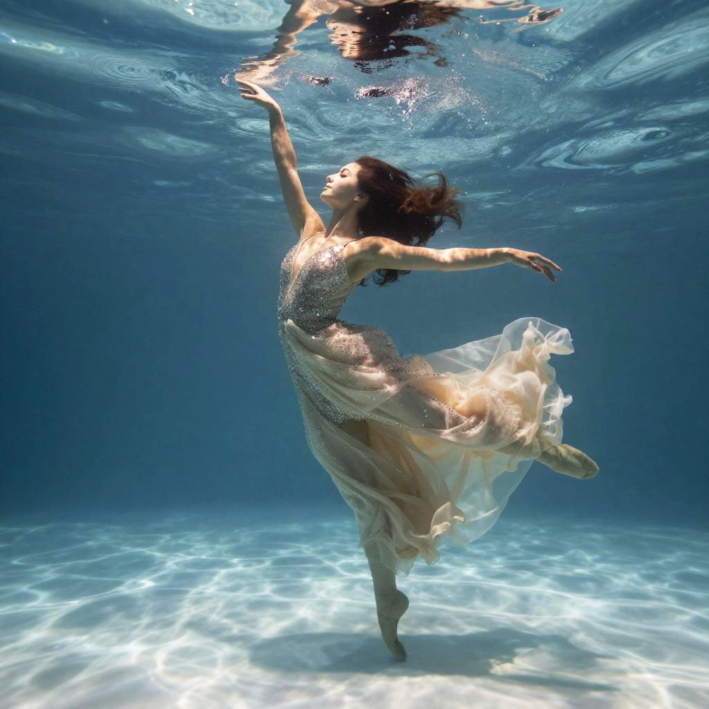 An ethereal image captures a woman gracefully dancing underwater, her long flowing dress made of multiple layers sparkling amidst the serene play of light and shadows.