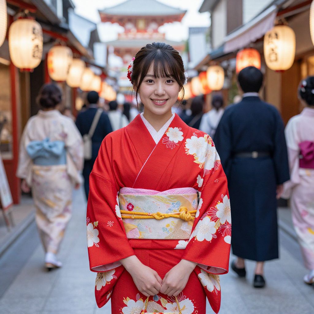 Photograph of a smiling Japanese woman in a vibrant red floral kimono, standing in a bustling evening street with lit lanterns.