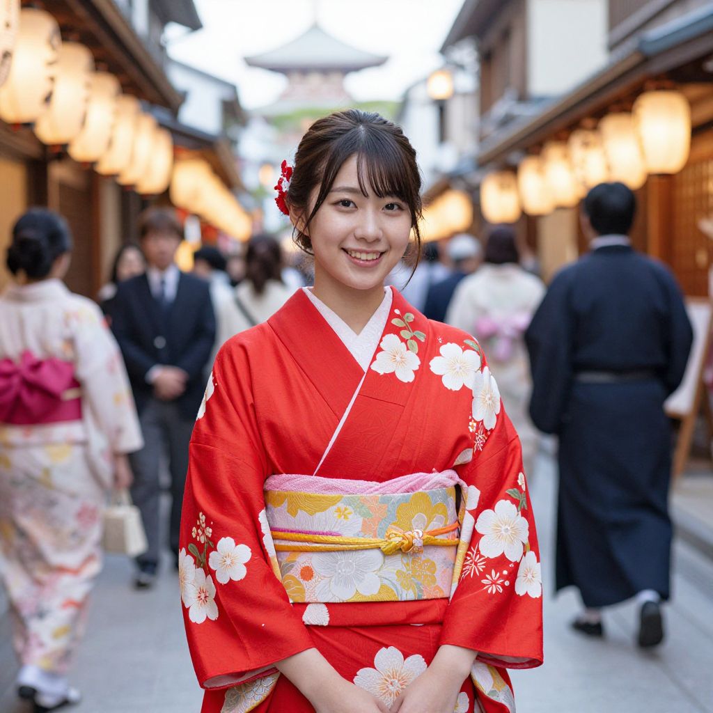 Radiant smiles and vibrant red kimono adorned with white floral patterns capture the essence of Coming of Age Day in Japan, as a young woman stands gracefully amidst the bustling streets lined with traditional lanterns and blurred figures in formal attire.